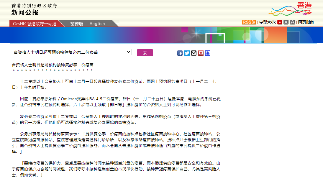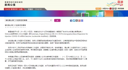 復星醫(yī)藥方面表示,復必泰二價疫苗可供12歲或以上人士作第四劑加強針選擇,康復人士可用作第三劑疫苗接種。根據(jù)香港特區(qū)政府官方又一信息稱,香港市民可于11月27日起可預約接種,12月1日正式開打復必泰二價疫苗。