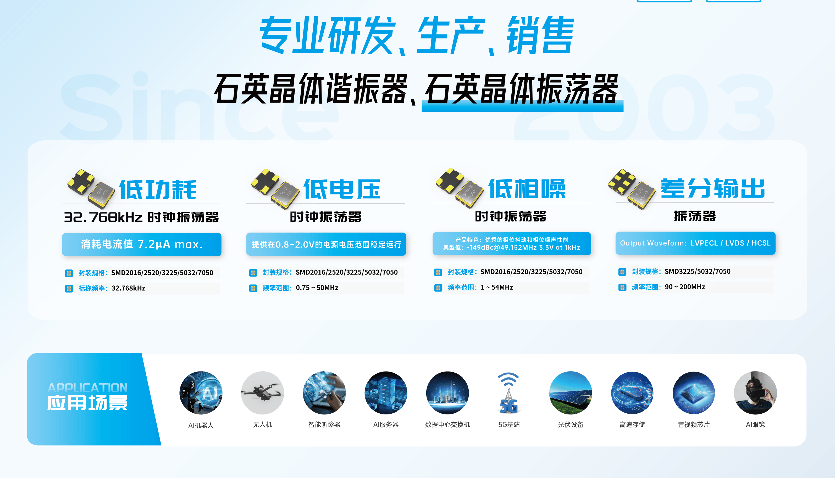本次展會(huì),星通時(shí)頻集中呈現(xiàn)了包括32.768kHz晶體、MHz晶體、SMD振蕩器(SPXO)、溫補(bǔ)晶振(TCXO)、壓控晶振(VCXO)、差分輸出振蕩器(DXO)、可編程晶振及車(chē)規(guī)級(jí)晶振等一系列產(chǎn)品與解決方案,全面覆蓋通信、工控、醫(yī)療、AI、新能源等多個(gè)熱門(mén)行業(yè)的需求。
